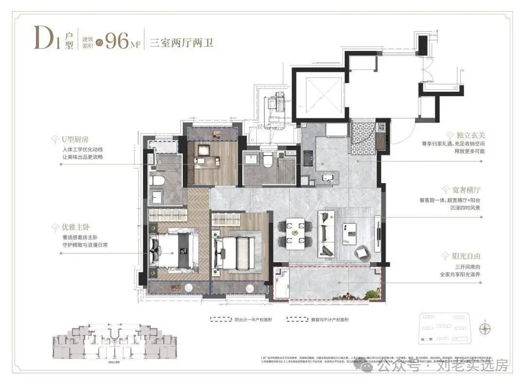 项目建面约103㎡3房同样是三开间+大横厅的布局,但尺度上更进一步。而且灵动空间更多,全屋飘窗+南向观景阳台,提升性价比的同时也增强户型对外的延展性。
