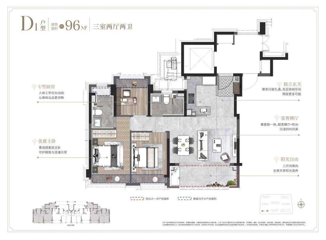 项目建面约103㎡3房同样是三开间+大横厅的布局,但尺度上更进一步。而且灵动空间更多,全屋飘窗+南向观景阳台,提升性价比的同时也增强户型对外的延展性。