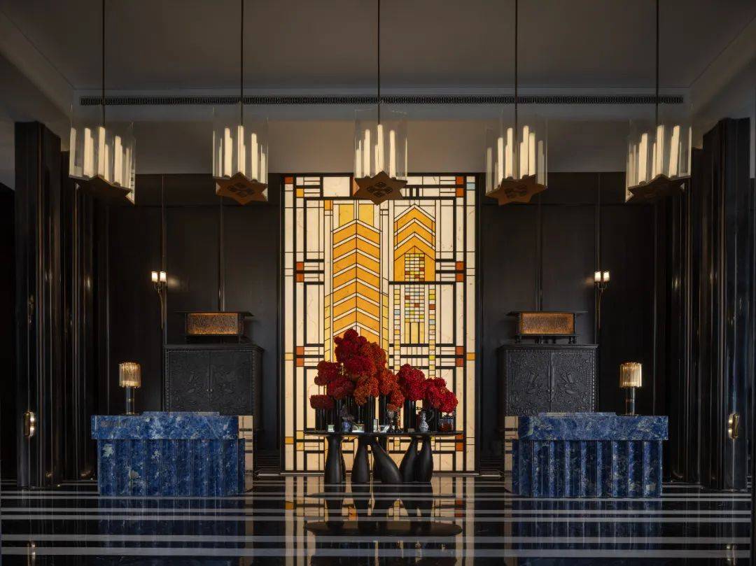 其次,项目的很多细节都融入了海派经典元素,比如落客区美轮美奂的约300㎡彩色玻璃穹顶,艺术连廊拱形廊道灵感都来自和平饭店。彩绘花窗的拱门造型则取自武康大楼。